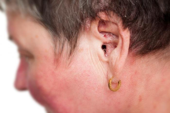 - ผิวมันเป็นแผ่น ปกคลุมด้วยสะเก็ดสีขาวหรือเหลือง หรือมีสะเก็ดแข็งบนหนังศีรษะ ใบหู