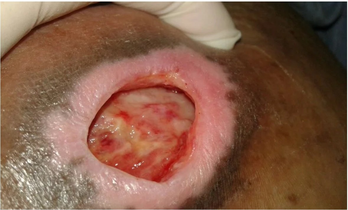 ผิวหนังหรือเนื้อเยื่อใต้ผิวหนังถูกทำลายแบบเฉพาะที่ เกิดเนื้อตายและเป็นแผลขึ้นมา